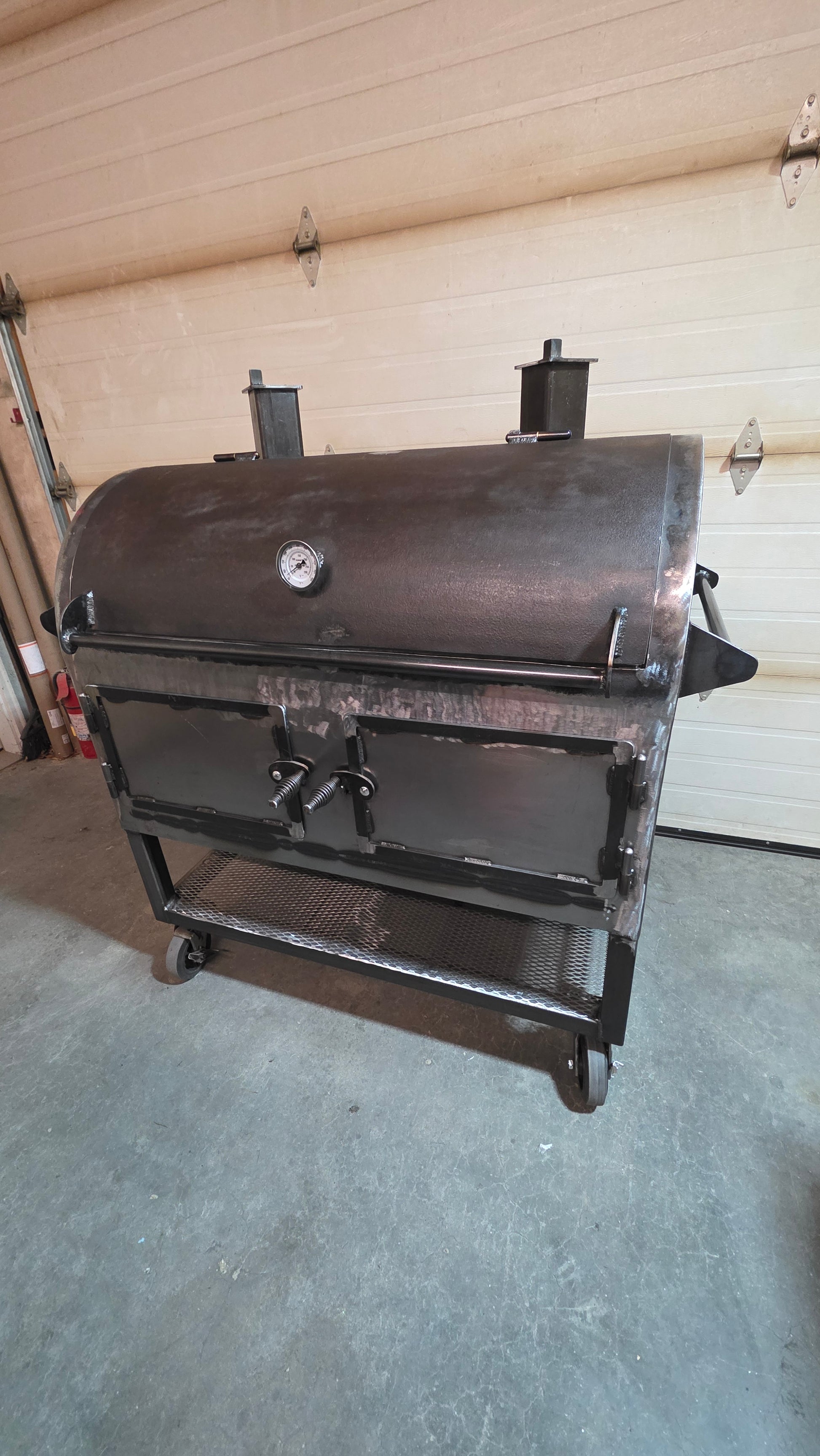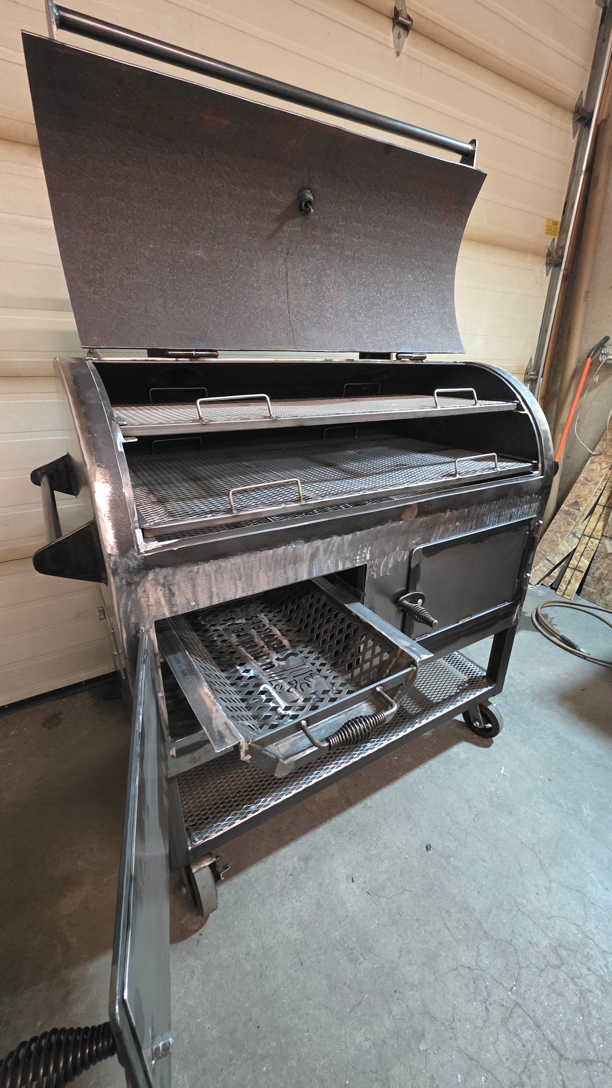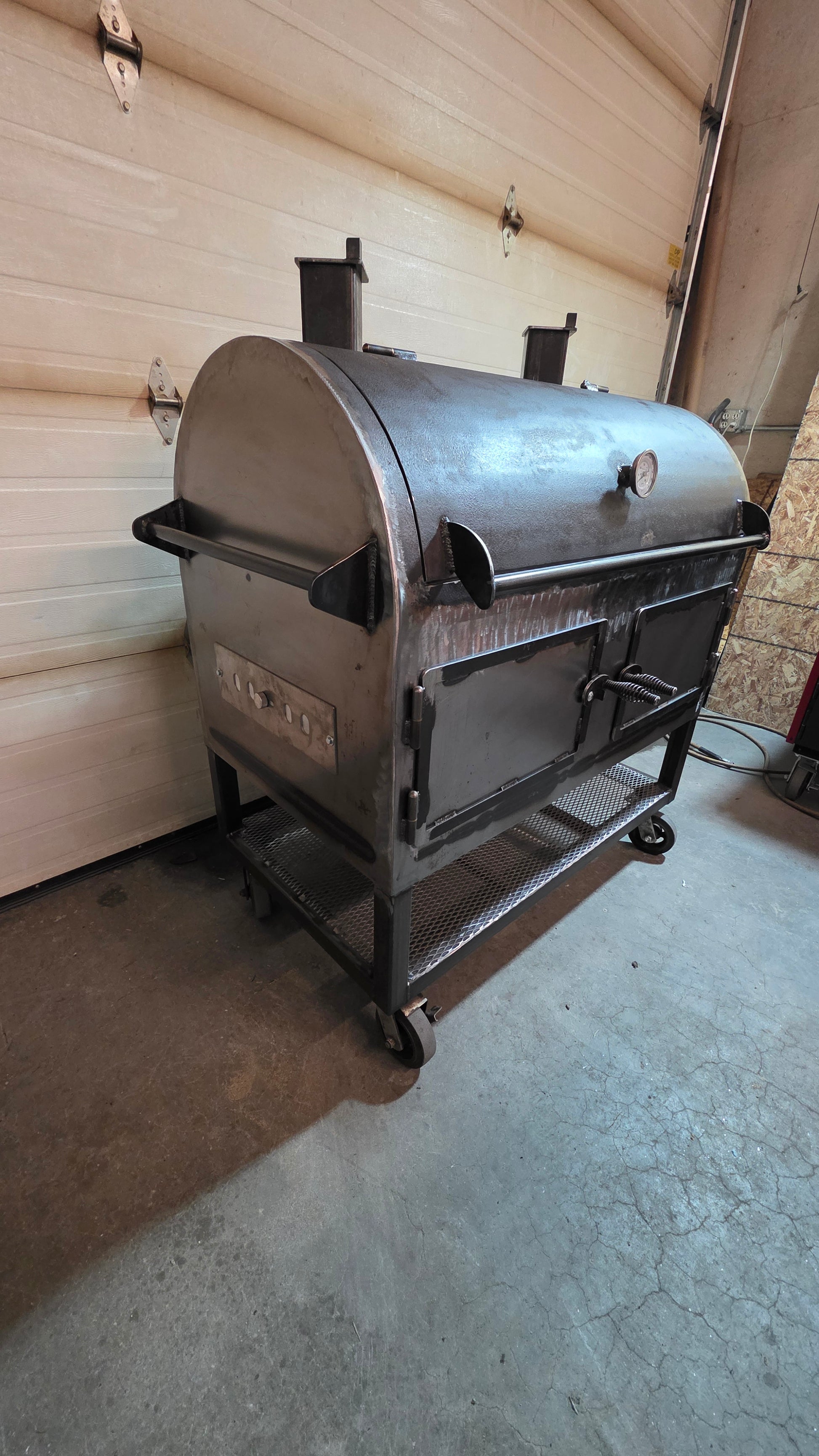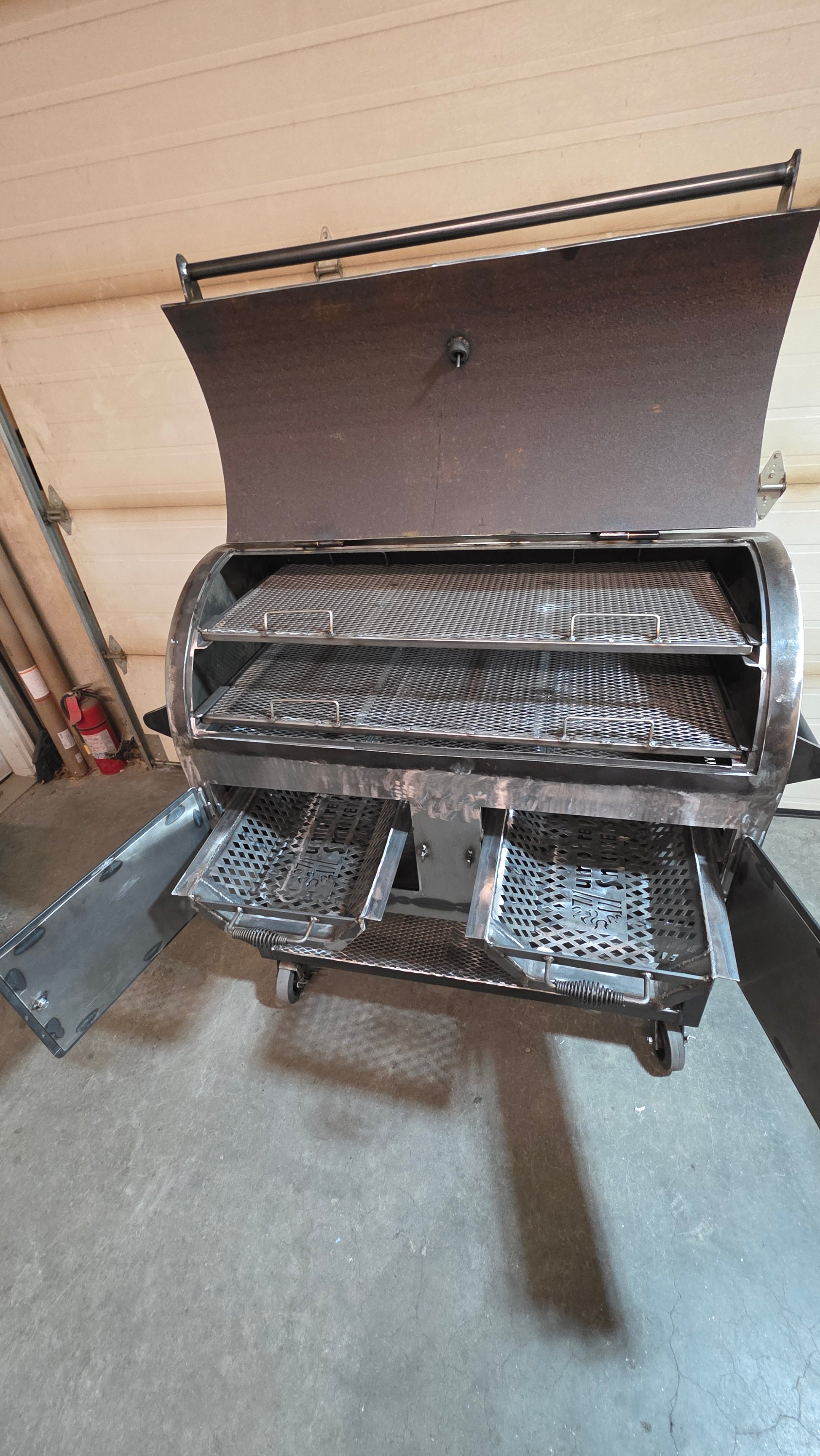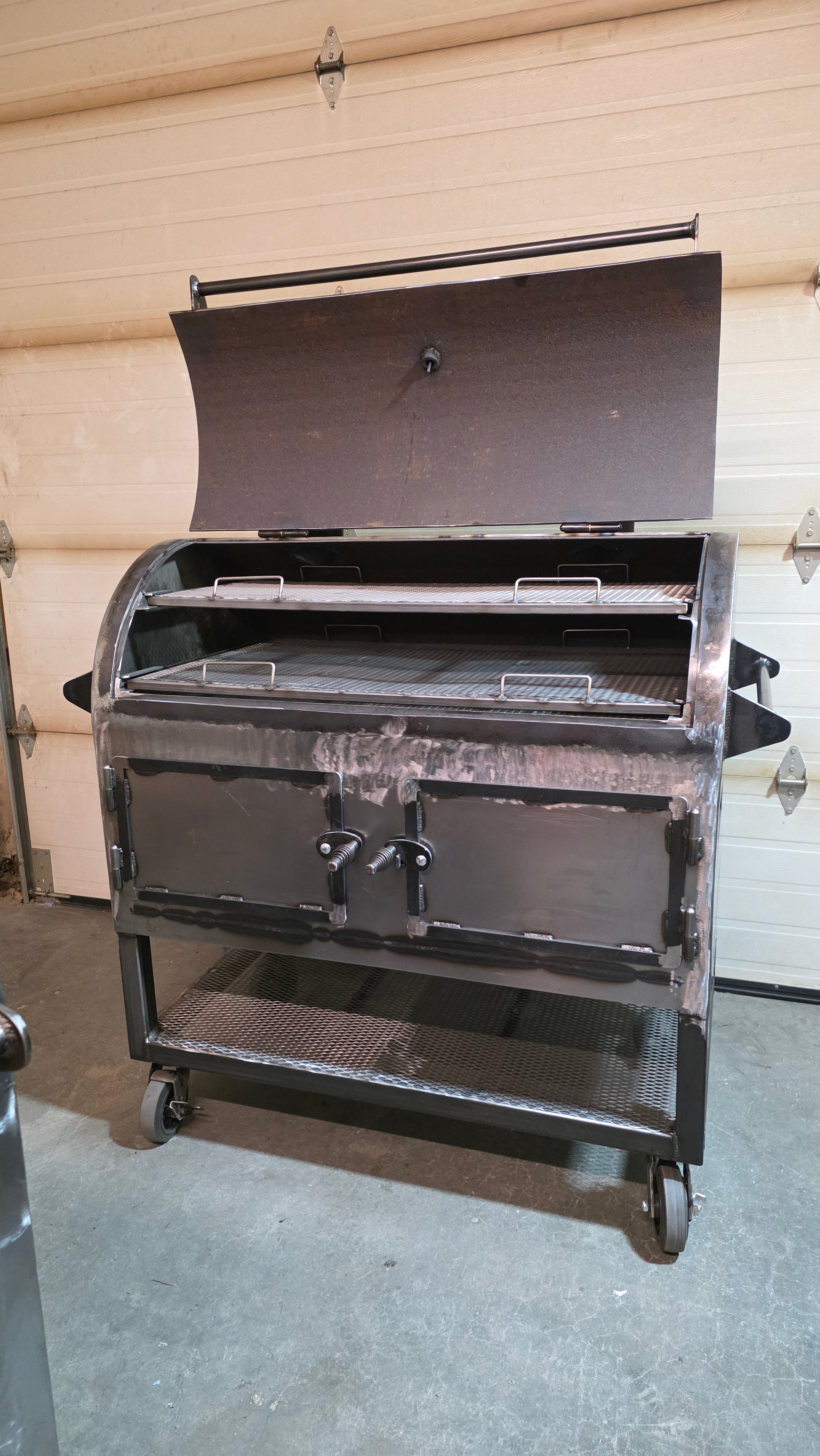 Kingpin #957 (larger than the Bootlegger) is a true one-of-one build, hand-crafted from steel as thick as ¼″ and built without compromise. This direct-cook style smoker features three full levels of cooking space, giving you flexibility whether you’re running straight fire, managing heat zones, or dialing in longer cooks.