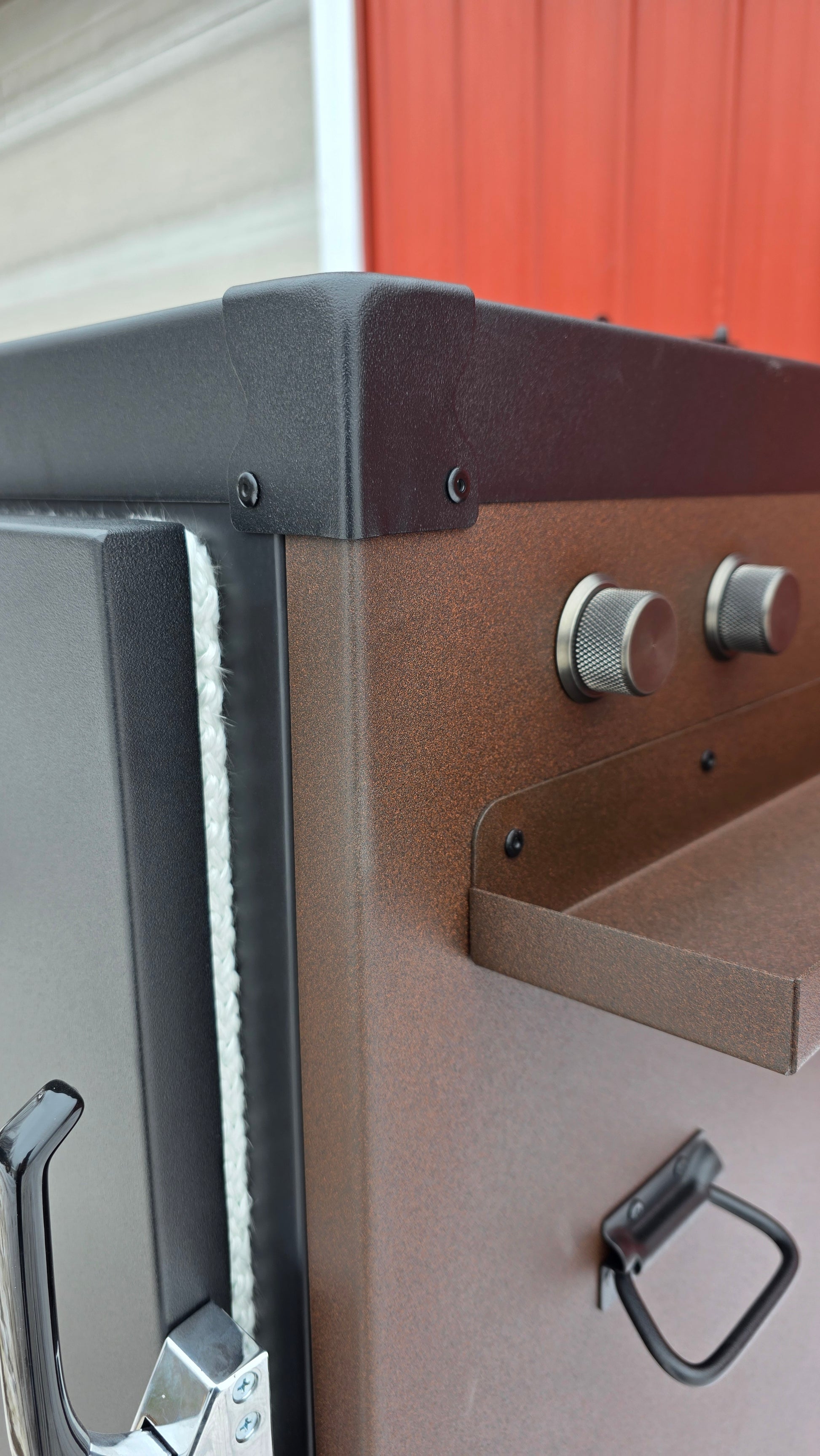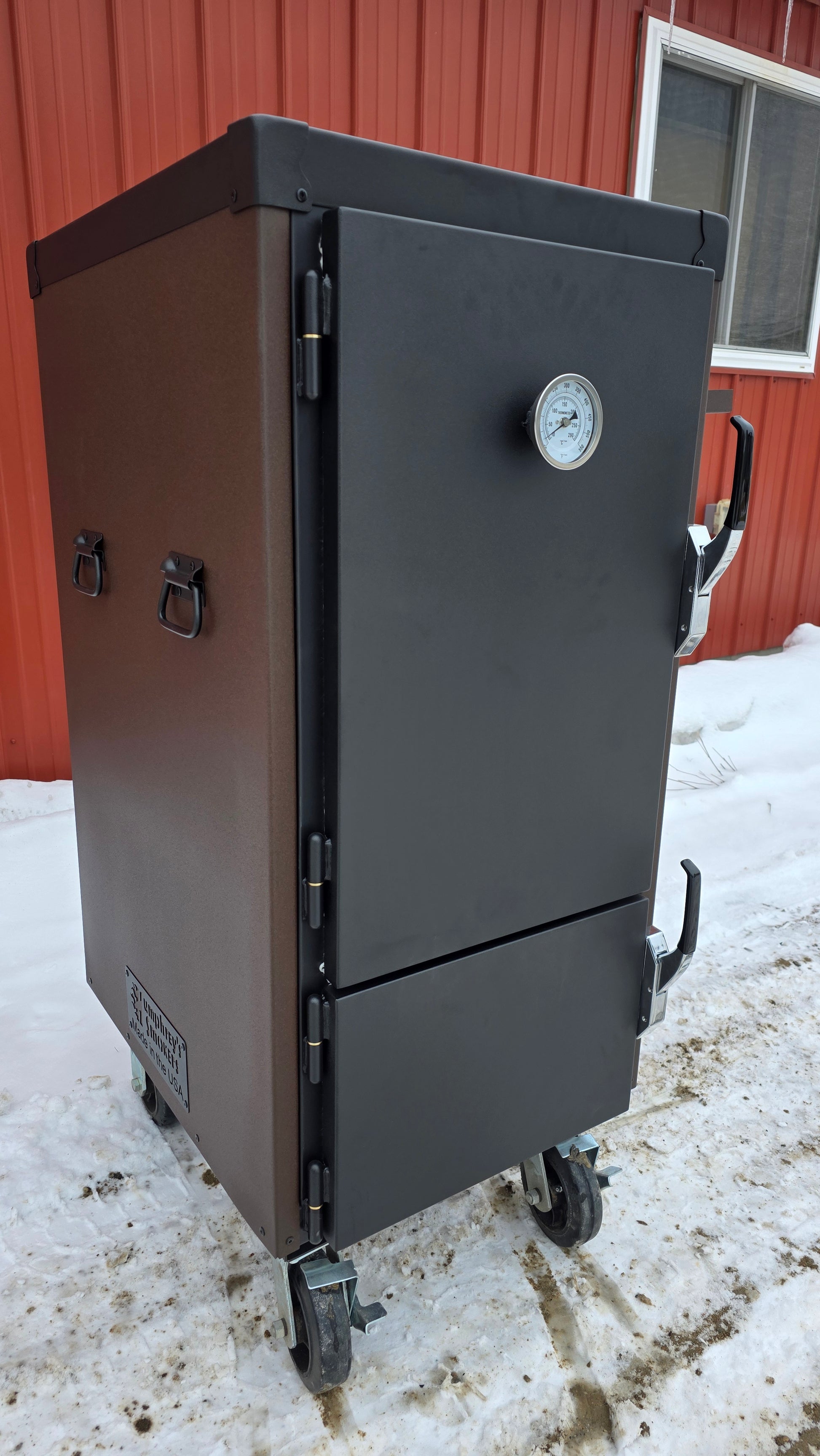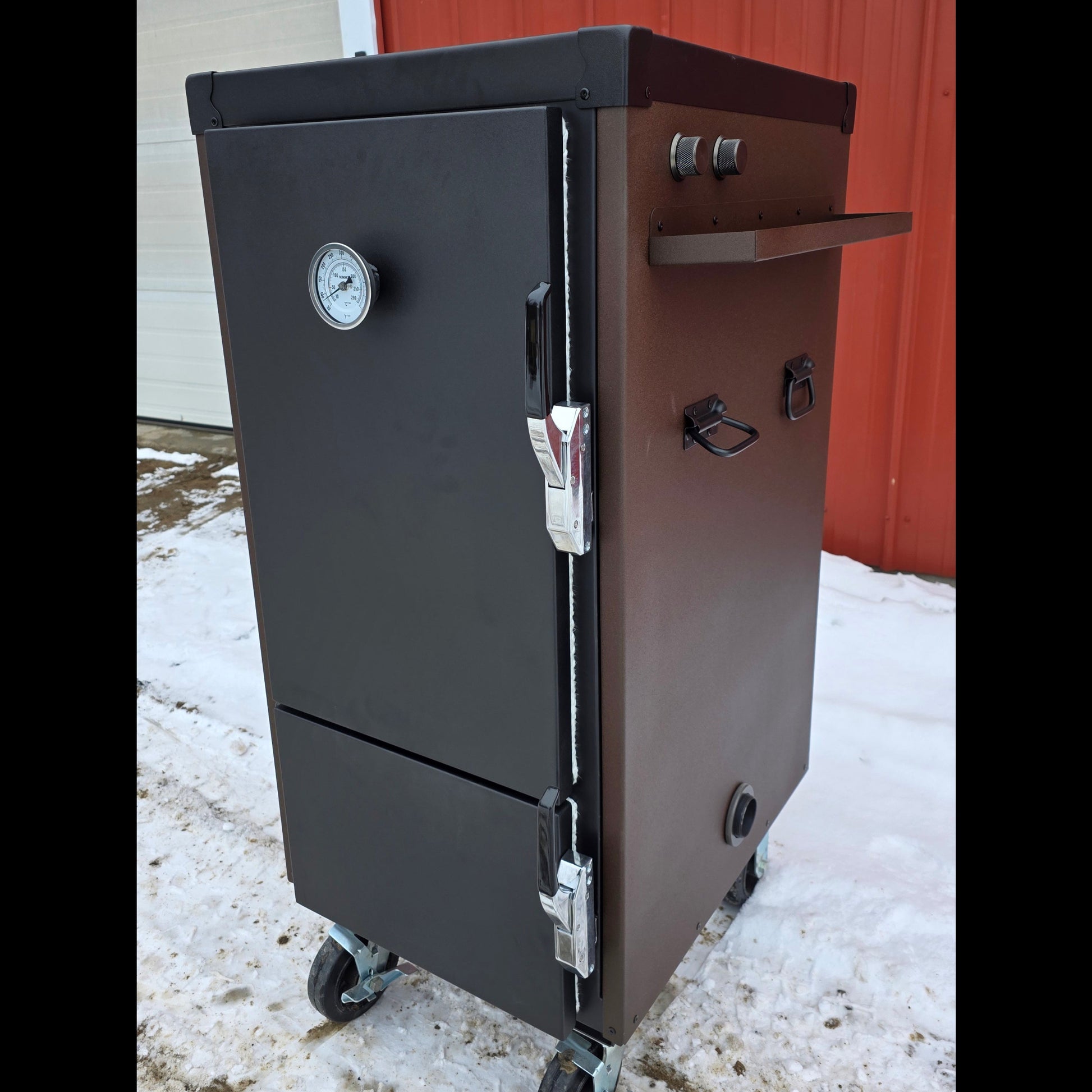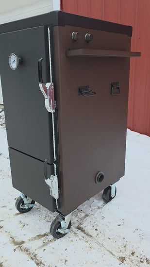 The textured speckled brown body brings the warm caramel and chocolate vibe, while the textured black top, doors, and hardware add a rugged contrast that gives the smoker its signature Snickers-style look. It’s the perfect blend of fun and function.