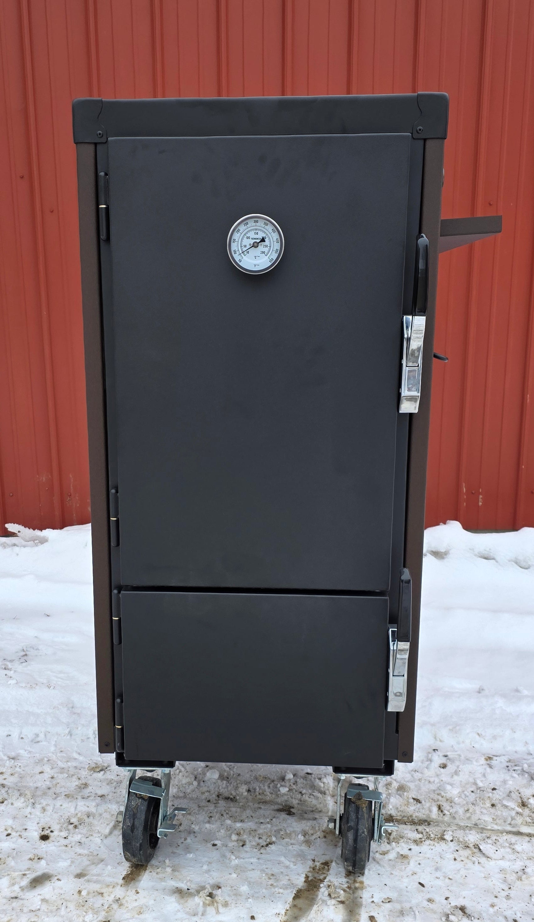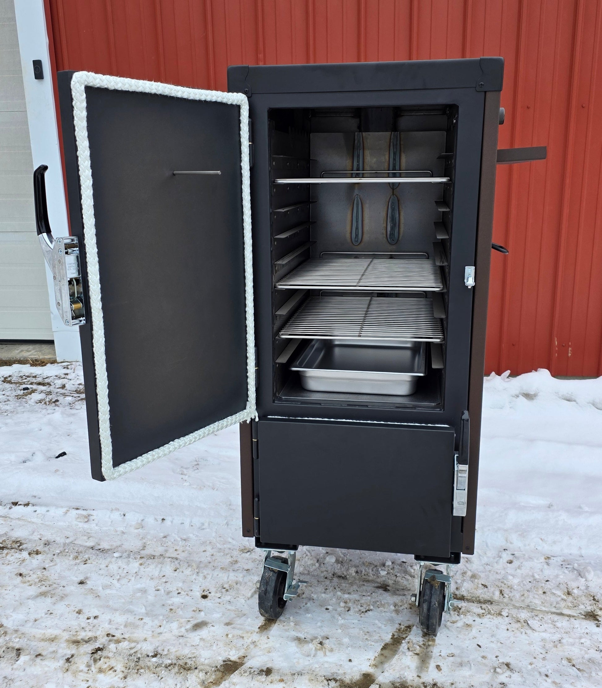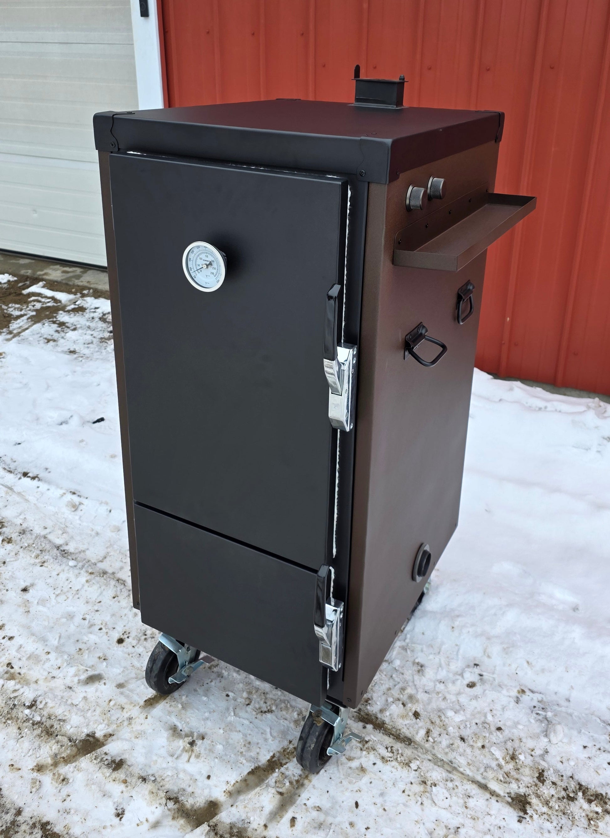 The textured speckled brown body brings the warm caramel and chocolate vibe, while the textured black top, doors, and hardware add a rugged contrast that gives the smoker its signature Snickers-style look. It’s the perfect blend of fun and function.