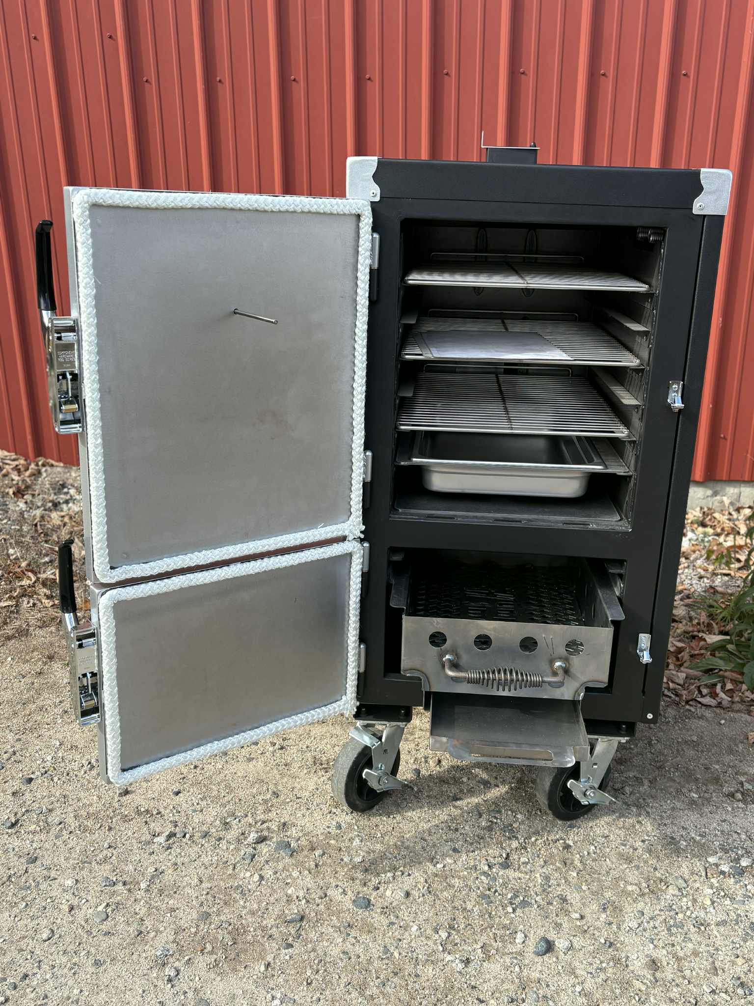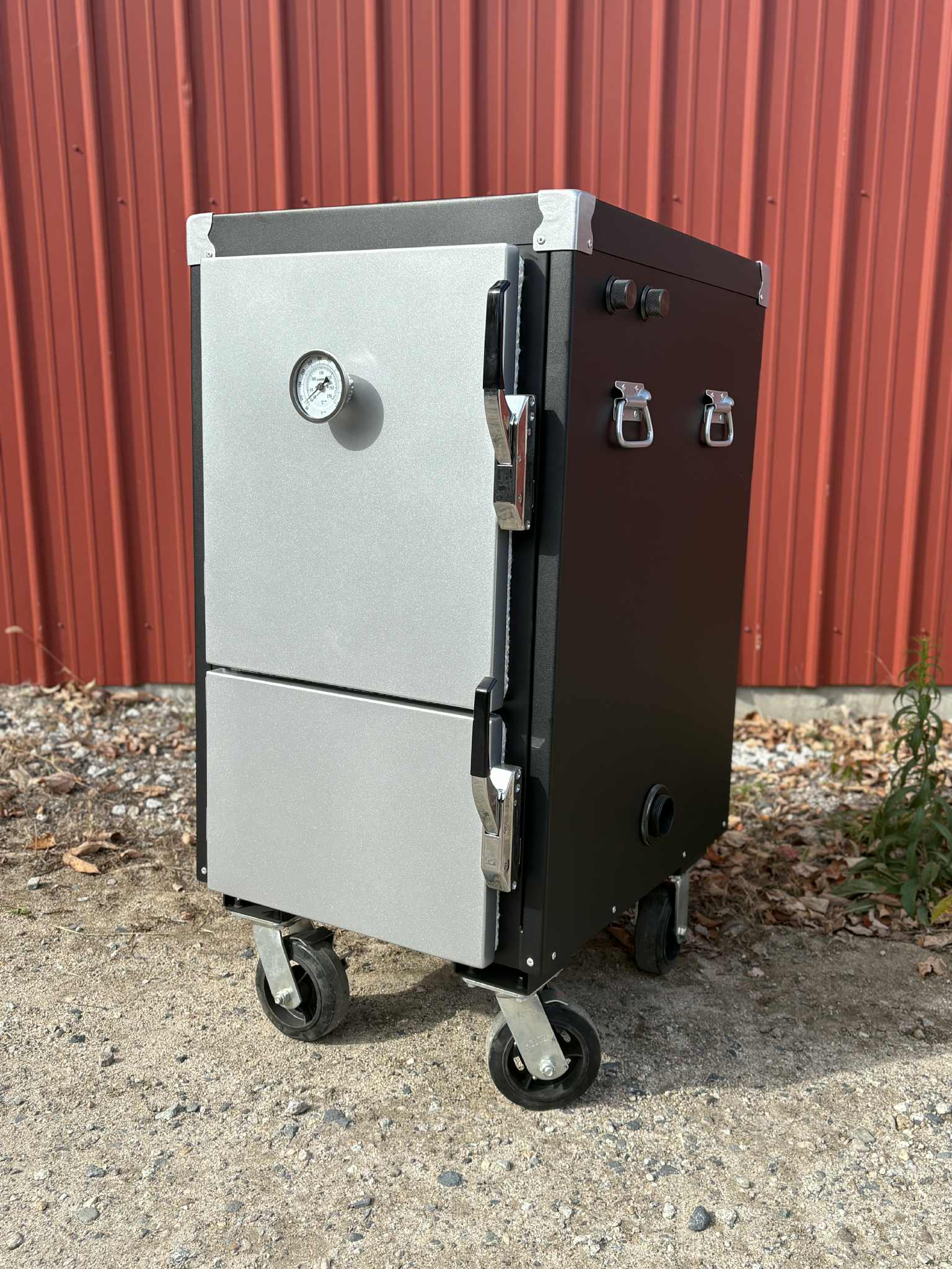 Check out this timeless color combination! Textured Black body with silver doors and hardware! This popular color choice in one of our most popular size smokers is sure to go quickly!